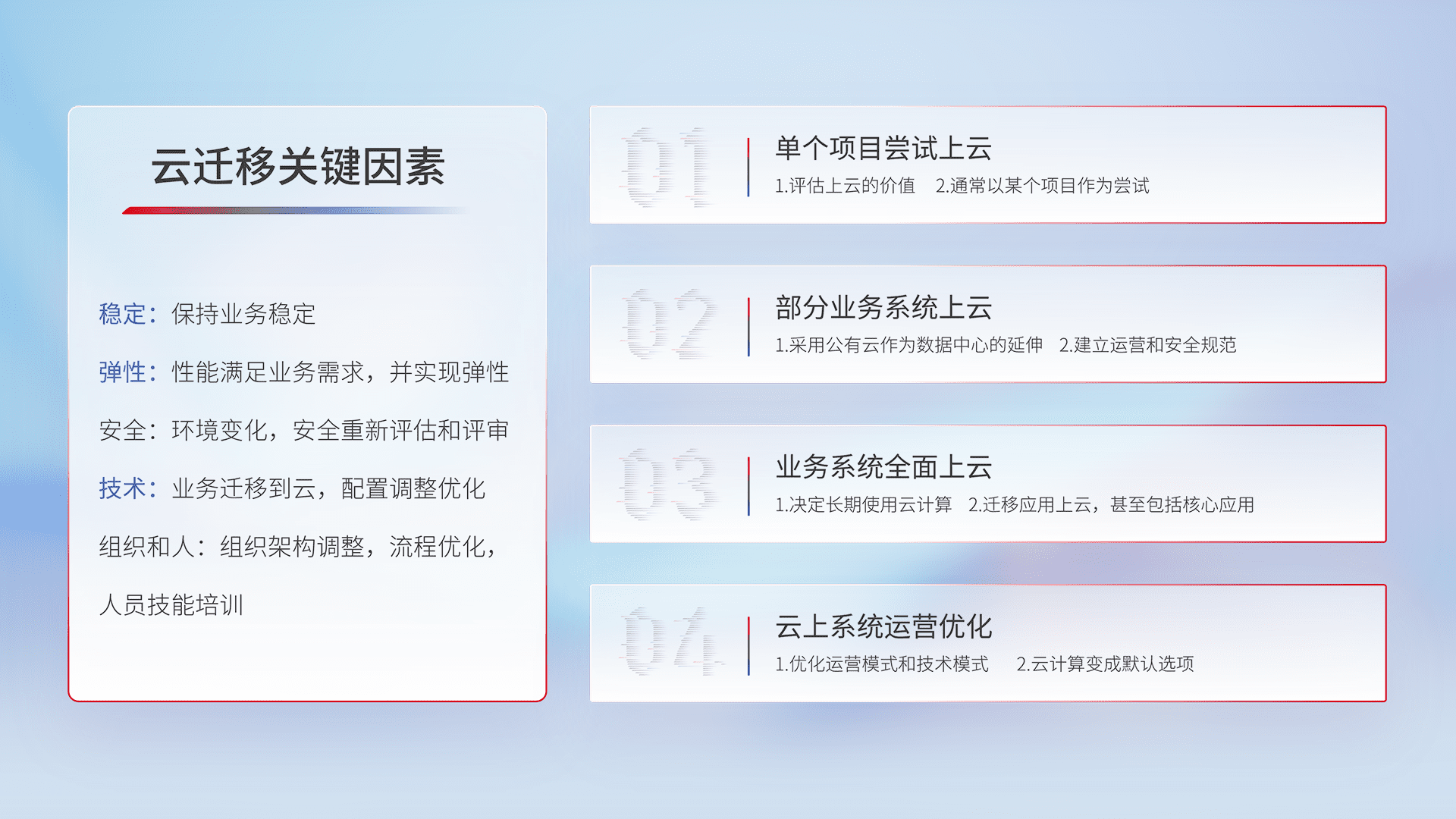 结合实际业务,,从规划设计、、、、云平台选型、、、、云原生改造、、、数据迁移、、集成交付,,,,迁移全过程为客户识别最佳上云路径,,,,做好风险识别管理,,设计网络架构、、、、身份权限、、安全审计合规、、、、操作审计、、日志审计、、、监控告警策略、、、多站点容灾设计等,,对云上基础设施进行整体规划,,,提升IT治理水平,,以满足弹性、、高可用、、、、高性能的需求。。