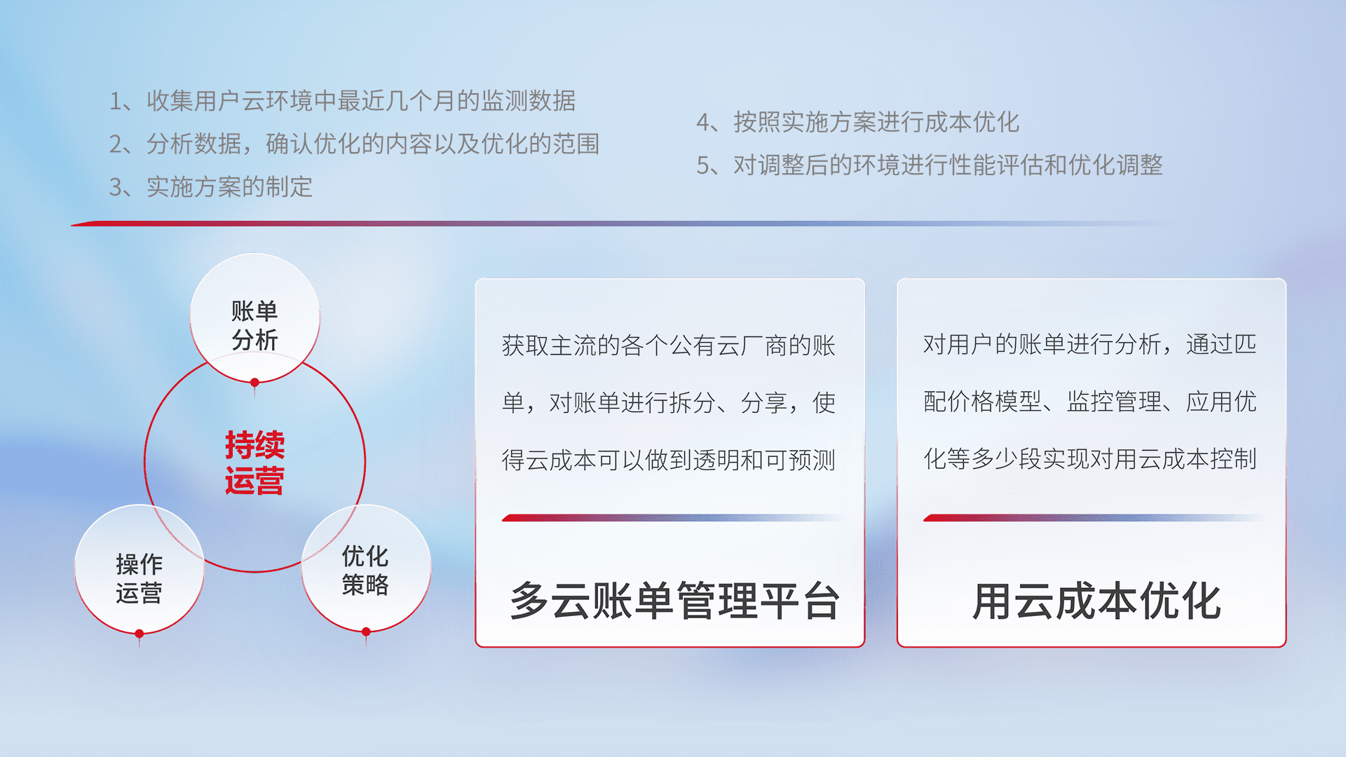 通过多云纳管,,,以统一的资源数据模型把客户的云资源进行抽象和封装,,,进而实现对多云资源的统一操作,,保障云资源管理的可靠性、、稳定性与可用性。。量身定制化运维内容,,,,配置、、、开发运维、、、补丁管理、、备份、、、监控、、、、认证和访问管理、、、、审计和日常巡检等,,保障在用云过程中的可靠度,,,,稳定度以及高可用率。。。。